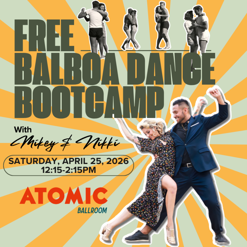 Ready to try one of the coolest swing dances without spending a dime? Join us at ATOMIC Ballroom for a FREE Balboa Dance Bootcamp with Nikki & Mikey on Saturday, April 25, 2026, from 12:15 PM to 2:15 PM. This beginner-friendly workshop is a fun, welcoming way to learn about Balboa, meet new people, and experience a dance that’s smooth, fast, connected, and totally addictive. Nikki and Mikey will guide you through the basics in a way that’s approachable, encouraging, and easy to follow, so you can come in curious and leave feeling accomplished. No pressure, no experience needed, and it’s free to attend.