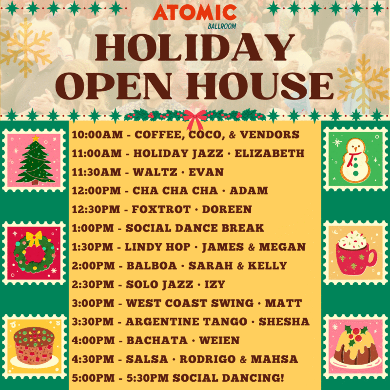 IJoin us Saturday, November 29th, for our Holiday Open House! A full festive day of FREE group classes, refreshments, Holiday vendors, and more! Come celebrate the wonderful dance family we all share here at ATOMIC Ballroom! Introduce someone new by inviting them to our Open House to dance with you.