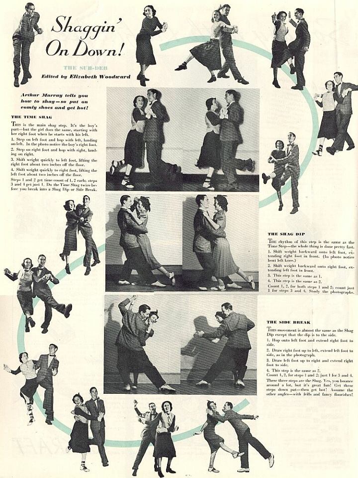“Collegiate” shag evolved from Shag a dance with no clear historical record, but assumed to be the based on early Foxtrot. The term “Shag” however is known to have been used as a slang term to describe early Vaudeville performers. The name association is presumed to relate to the lively performance nature of the dance. The differences in rhythm most likely were due to lack of standardization of Foxtrot basics at the time and the prevalence of regional styling. It was named “Collegiate” Shag most likely as a marketing ploy as many “Collegiate” dances were being created at the time for marketed towards the young (“college age”) dancers. These “Collegiate” dances were leaping/hopping versions of their early ballroom counterparts. The name was derived from the way college youth would liven up the dances of old. These forms are known to pre-date the lindy hop and balboa. Other breeds of Shag were later created such as Carolina shag and St. Louis shag. These other forms only share its name “Shag” not technique or imagery. This is again, most likely, due to its slang association with performance dances.
